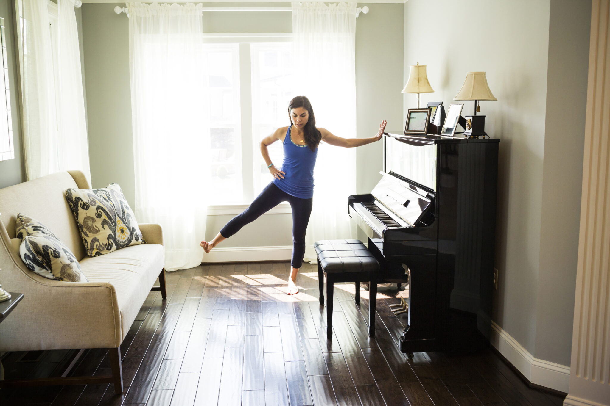 Woman stretching at window